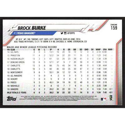 This is a 2020 Topps Chrome Brock Burke baseball card. The card is #159 and pictures show condition.
