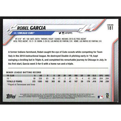 This is a 2020 Topps Chrome Robel Garcia baseball card. The card is #181 and pictures show condition.