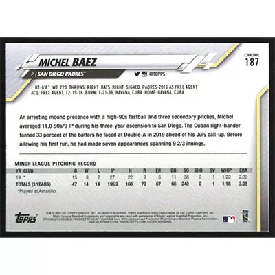 This is a 2020 Topps Chrome Michel Baez baseball card. The card is #187 and pictures show condition.