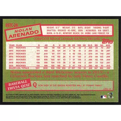 This is a 2020 Topps Chrome '85 Nolan Arenado baseball card. The card is #85TC-24 and pictures show condition.