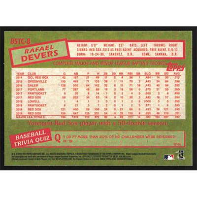 This is a 2020 Topps Chrome '85 Rafael Devers baseball card. The card is #85TC-8 and pictures show condition.