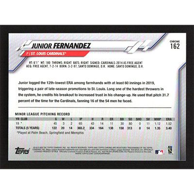 This is a 2020 Topps Chrome Ben Baller Junior Fernandez baseball card. The card is #162 and pictures show condition. Team(s): St. Louis Cardinals Rookie Card (RC)