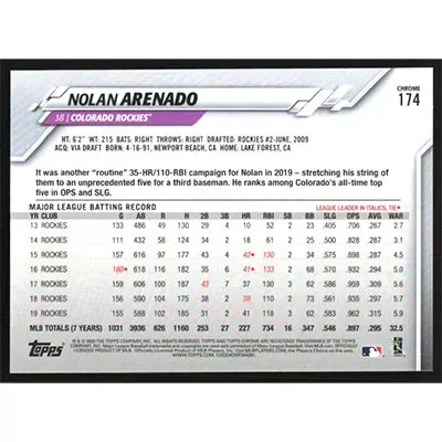 This is a 2020 Topps Chrome Ben Baller Nolan Arenado baseball card. The card is #174 and pictures show condition.