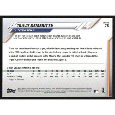 This is a 2020 Topps Chrome Ben Baller Travis Demeritte baseball card. The card is #26 and pictures show condition. Team(s): Detroit Tigers Rookie Card (RC)