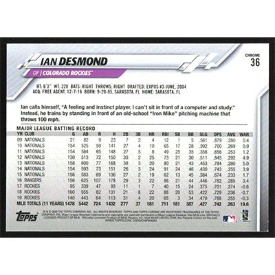 This is a 2020 Topps Chrome Ben Baller Ian Desmond baseball card. The card is #36 and pictures show condition.