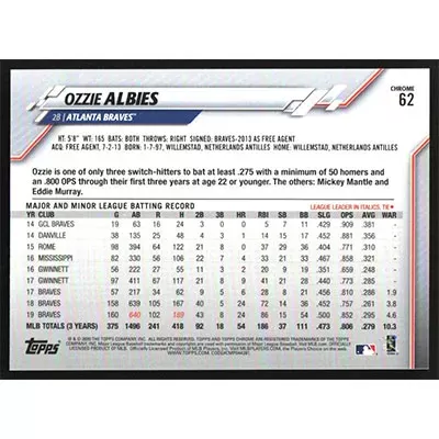 This is a 2020 Topps Chrome Ben Baller Ozzie Albies baseball card. The card is #62 and pictures show condition.