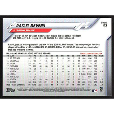 This is a 2020 Topps Chrome Ben Baller Rafael Devers baseball card. The card is #93 and pictures show condition.