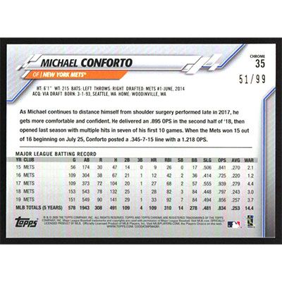 This is a 2020 Topps Chrome Ben Baller Green Refractors Michael Conforto baseball card. The card is #35 and pictures show condition. This card is limited; #'d 51/99.