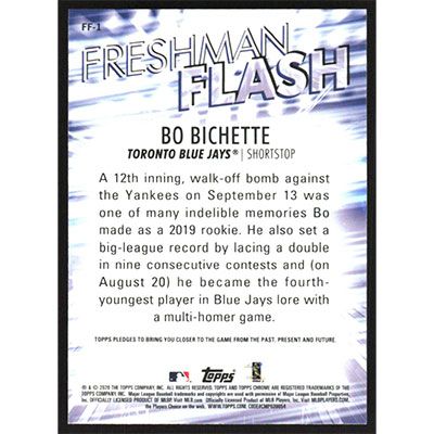 This is a 2020 Topps Chrome Freshman Flash Bo Bichette baseball card. The card is #FF-1 and pictures show condition. Team(s): Toronto Blue Jays Rookie Card (RC)