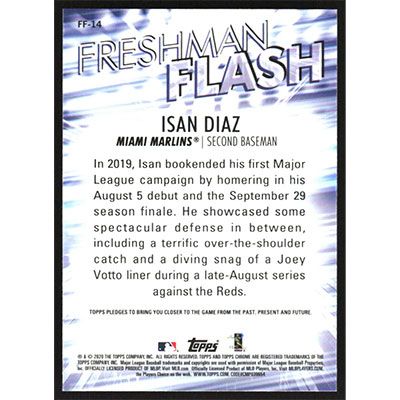 This is a 2020 Topps Chrome Freshman Flash Isan Diaz baseball card. The card is #FF-14 and pictures show condition. Team(s): Miami Marlins Rookie Card (RC)