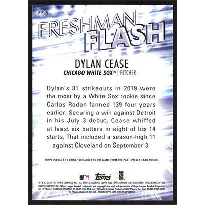 This is a 2020 Topps Chrome Freshman Flash Dylan Cease baseball card. The card is #FF-3 and pictures show condition. Team(s): Chicago White Sox Rookie Card (RC)