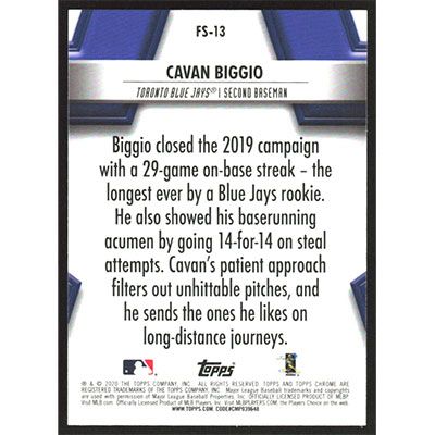 This is a 2020 Topps Chrome Future Stars Cavan Biggio baseball card. The card is #FS-13 and pictures show condition.