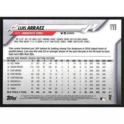 This is a 2020 Topps Chrome Negative Refractors Luis Arraez baseball card. The card is #172 and pictures show condition.