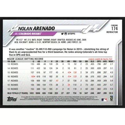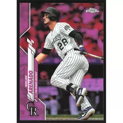This is a 2020 Topps Chrome Pink Refractors Nolan Arenado baseball card. The card is #174 and pictures show condition.