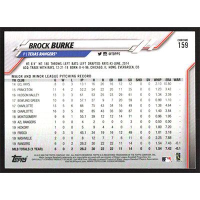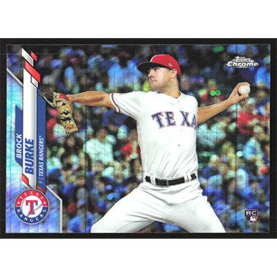 This is a 2020 Topps Chrome Prism Refractors Brock Burke baseball card. The card is #159 and pictures show condition. Team(s): Texas Rangers Rookie Card (RC)