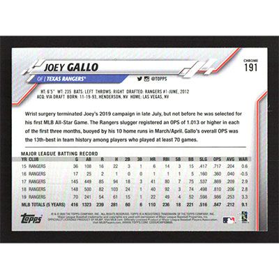 This is a 2020 Topps Chrome Prism Refractors Joey Gallo baseball card. The card is #191 and pictures show condition.