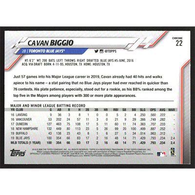 This is a 2020 Topps Chrome Prism Refractors Cavan Biggio baseball card. The card is #22 and pictures show condition.