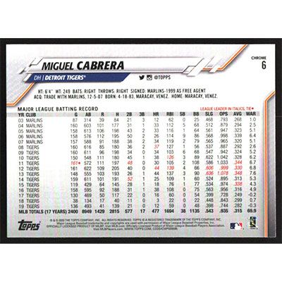 This is a 2020 Topps Chrome Prism Refractors Miguel Cabrera baseball card. The card is #6 and pictures show condition.