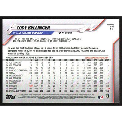 This is a 2020 Topps Chrome Prism Refractors Cody Bellinger baseball card. The card is #77 and pictures show condition.