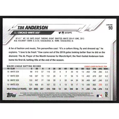 This is a 2020 Topps Chrome Prism Refractors Tim Anderson baseball card. The card is #90 and pictures show condition.