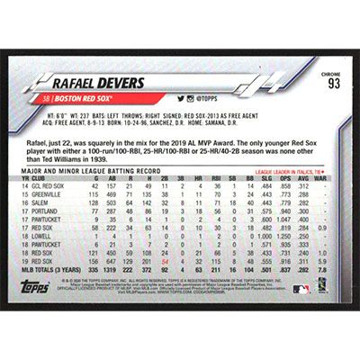 This is a 2020 Topps Chrome Prism Refractors Rafael Devers baseball card. The card is #93 and pictures show condition.
