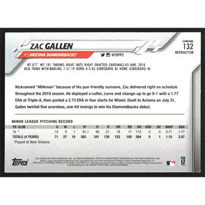 This is a 2020 Topps Chrome Refractors Zac Gallen baseball card. The card is #132 and pictures show condition. Team(s): Arizona Diamondbacks Rookie Card (RC)