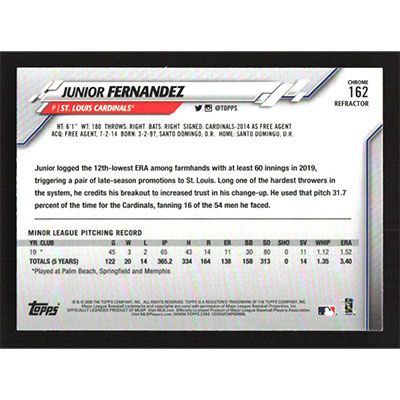This is a 2020 Topps Chrome Refractors Junior Fernandez baseball card. The card is #162 and pictures show condition. Team(s): St. Louis Cardinals Rookie Card (RC)