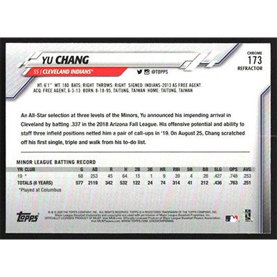 This is a 2020 Topps Chrome Refractors Yu Chang baseball card. The card is #173 and pictures show condition. Team(s): Cleveland Indians Rookie Card (RC)