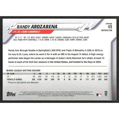 This is a 2020 Topps Chrome Refractors Randy Arozarena baseball card. The card is #49 and pictures show condition. Team(s): St. Louis Cardinals Rookie Card (RC)