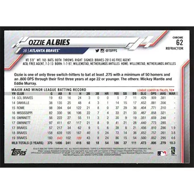 This is a 2020 Topps Chrome Refractors Ozzie Albies baseball card. The card is #62 and pictures show condition.
