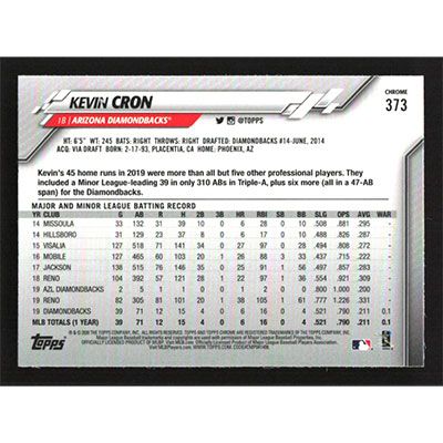 This is a 2020 Topps Chrome Sapphire Kevin Cron baseball card. The card is #373 and pictures show condition.