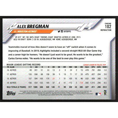 This is a 2020 Topps Chrome Sepia Refractors Alex Bregman baseball card. The card is #102 and pictures show condition.