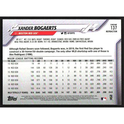 This is a 2020 Topps Chrome Sepia Refractors Xander Bogaerts baseball card. The card is #137 and pictures show condition.