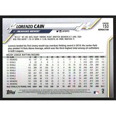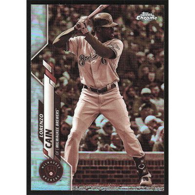 This is a 2020 Topps Chrome Sepia Refractors Lorenzo Cain baseball card. The card is #153 and pictures show condition.