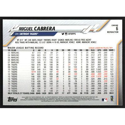 This is a 2020 Topps Chrome Sepia Refractors Miguel Cabrera baseball card. The card is #6 and pictures show condition.