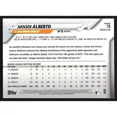 This is a 2020 Topps Chrome Sepia Refractors Hanser Alberto baseball card. The card is #79 and pictures show condition.