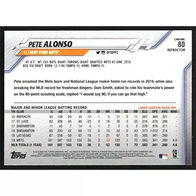 This is a 2020 Topps Chrome Sepia Refractors Pete Alonso baseball card. The card is #80 and pictures show condition.