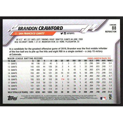 This is a 2020 Topps Chrome Sepia Refractors Brandon Crawford baseball card. The card is #88 and pictures show condition.