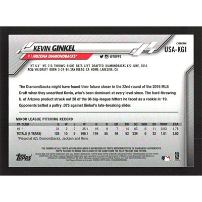 This is a 2020 Topps Chrome Update Autographs Refractors Kevin Ginkel autographed baseball card. This card has been signed, in blue, by Kevin Ginkel, and is certified authentic by Topps. The card is #USA-KGI and pictures show condition.