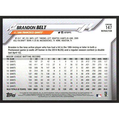This is a 2020 Topps Chrome X-Fractors Brandon Belt baseball card. The card is #147 and pictures show condition.