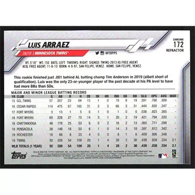 This is a 2020 Topps Chrome X-Fractors Luis Arraez baseball card. The card is #172 and pictures show condition.