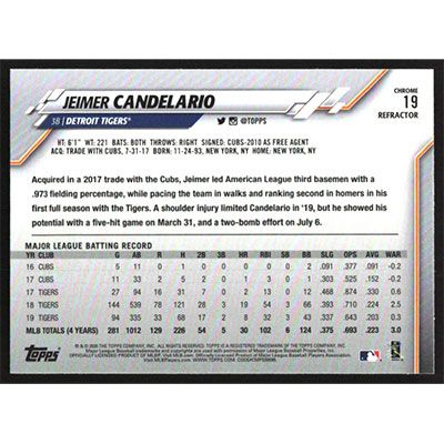 This is a 2020 Topps Chrome X-Fractors Jeimer Candelario baseball card. The card is #19 and pictures show condition.