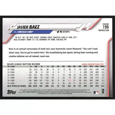 This is a 2020 Topps Chrome X-Fractors Javier Baez baseball card. The card is #198 and pictures show condition.
