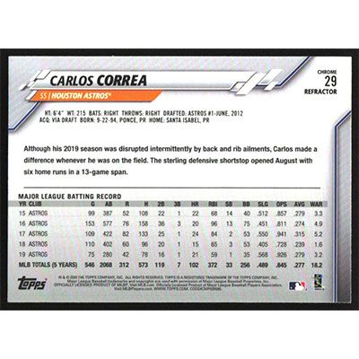 This is a 2020 Topps Chrome X-Fractors Carlos Correa baseball card. The card is #29 and pictures show condition.