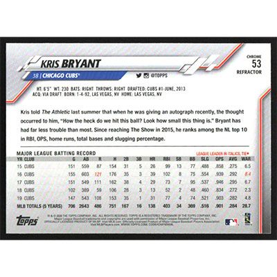 This is a 2020 Topps Chrome X-Fractors Kris Bryant baseball card. The card is #53 and pictures show condition.