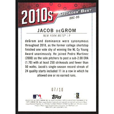 This is a 2020 Topps Decades' Best Chrome Red Jacob deGrom baseball card. The card is #DBC-95 and pictures show condition. This card is limited; #'d 10-Jul.
