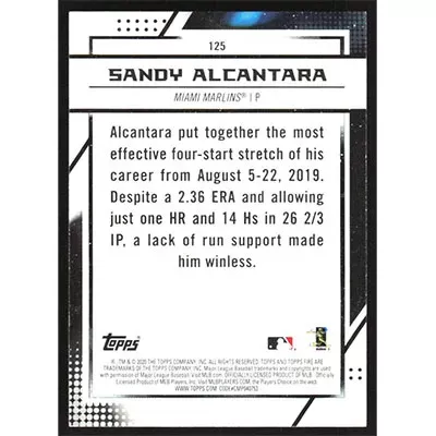 This is a 2020 Topps Fire Sandy Alcantara baseball card. The card is #125 and pictures show condition.