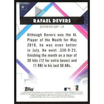 This is a 2020 Topps Fire Rafael Devers baseball card. The card is #37 and pictures show condition.