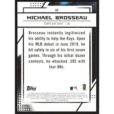 This is a 2020 Topps Fire Gold Minted Michael Brosseau baseball card. The card is #89 and pictures show condition. Team(s): Tampa Bay Rays Rookie Card (RC)