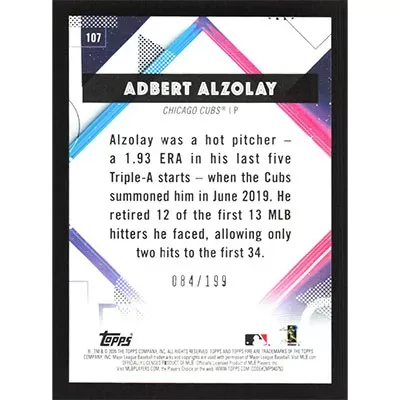 This is a 2020 Topps Fire Green Adbert Alzolay baseball card. The card is #107 and pictures show condition. This card is limited; #'d 084/199. Team(s): Chicago Cubs Rookie Card (RC)